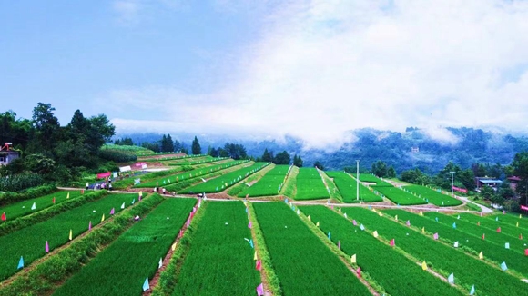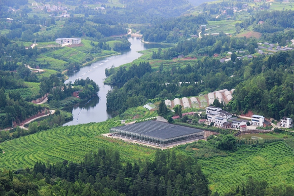 在花千谷玻璃观景台上,有山有水有人家的田园风光尽收眼底。层峦叠嶂之间,果蔬、桑田绿意盎然,一条条白色的小道蜿蜒在山间,串联起每一户人家,现代农业产业园的建设为凤鸣镇带来了蓬勃生机。