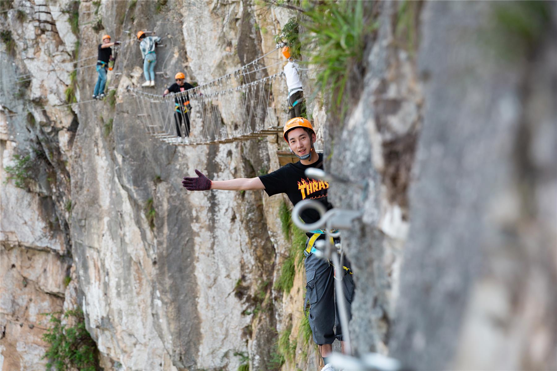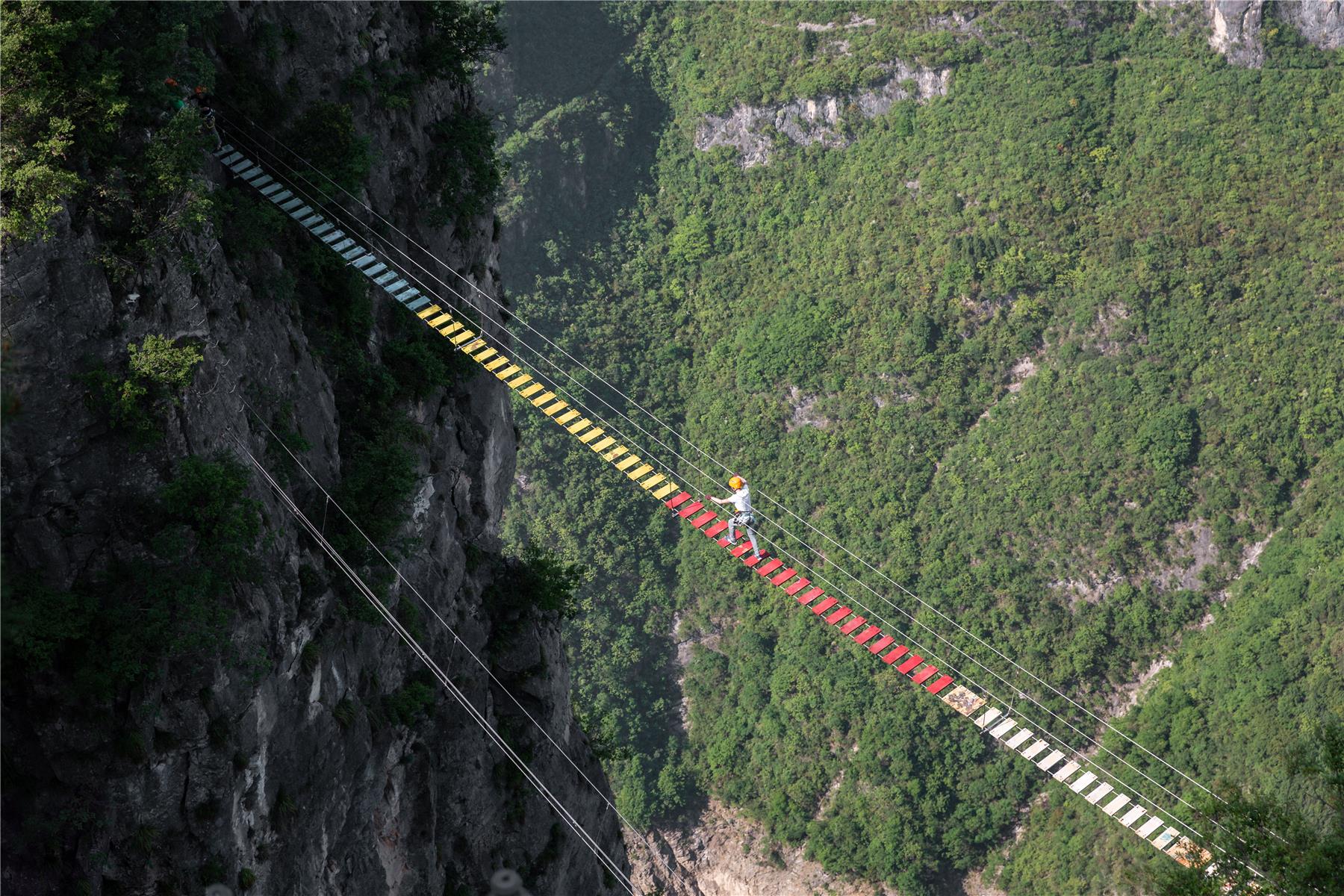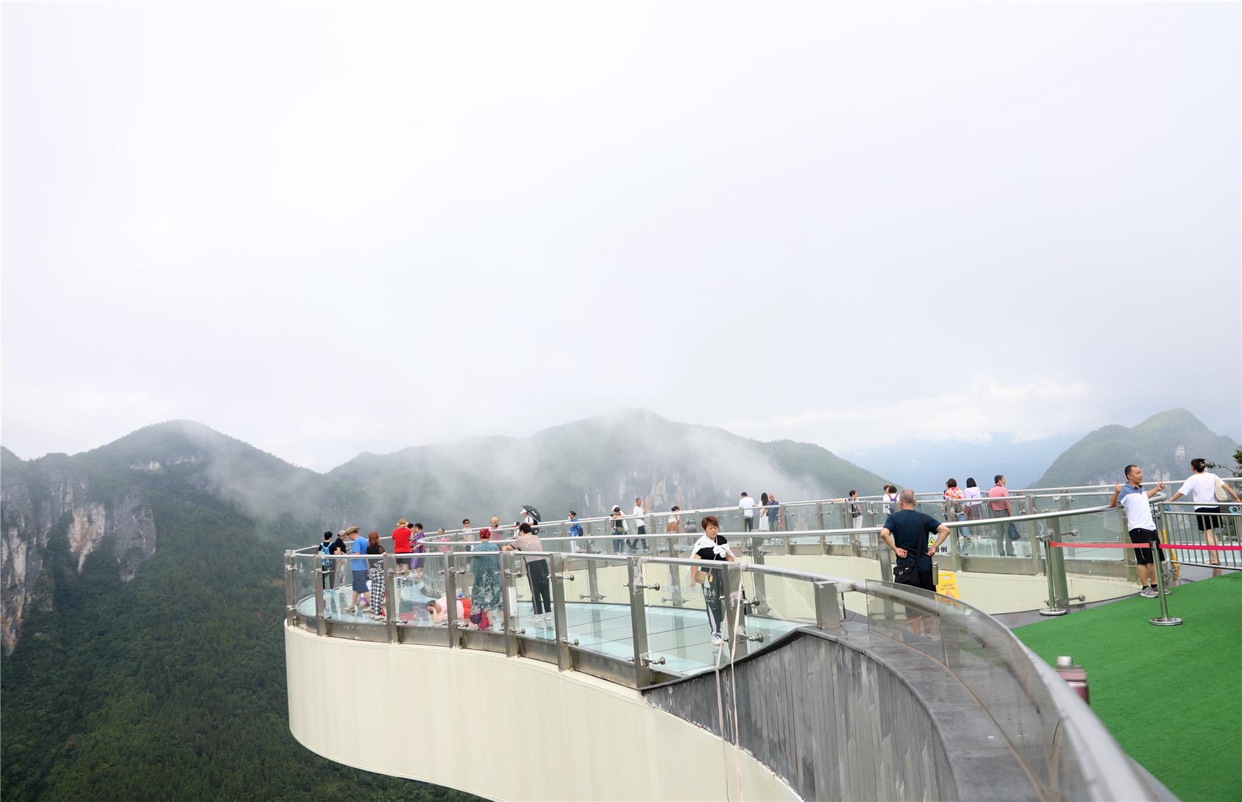 来到千米之巅的云端廊桥,一大批游客正站在廊桥上,脚踩山水绝壁、头顶白云蓝天,感受“直穷绝顶高,始觉天地阔”的豁然开朗,并争相拿出手机或相机拍照合影。