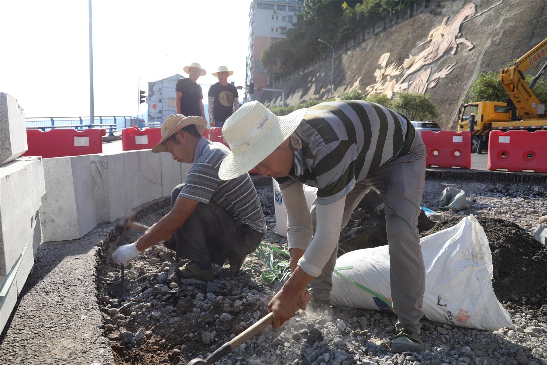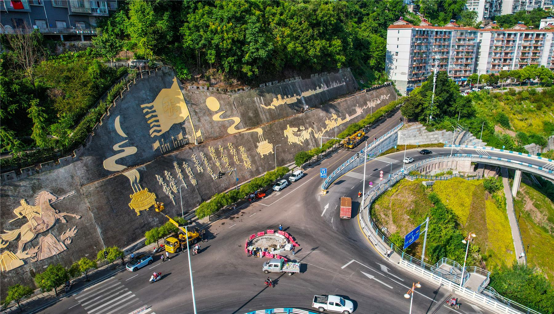 建好一座公园城,画好一幅山水画。云阳长江大桥南桥头是我县江南片区交通的主动脉,向南可通行至云利路、盘丁路,到达龙缸景区、三峡阳菊基地、万州花果山;向西可到盘九路、张飞庙、滑翔伞基地。施工现场,工人们在加班加点地对南桥头景观工程进行改造。目前,张飞文化墙、南桥头转盘花池以及6000平方米的建筑立面风貌改造等项目已全部进场施工,现场呈现出一派热火朝天的施工景象。