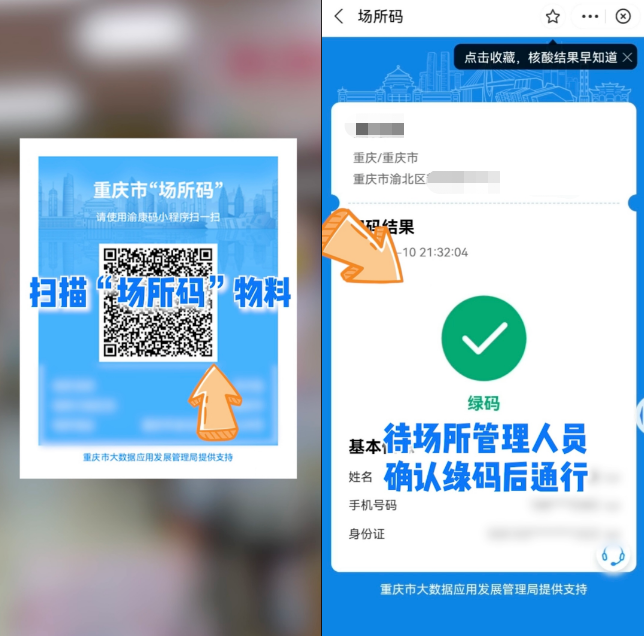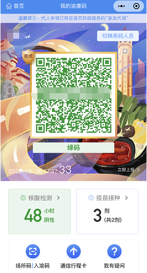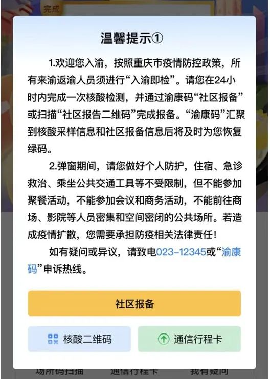 ——“入渝码”:你可以把它理解成整个重庆的“场所码”,这个码是你从市外到重庆时必须扫描的。但是,扫“入渝码”不是目的,扫“入渝码”后,需要请你根据弹窗提示“入渝即报”“入渝即检”,也就是完成社区报告和1次核酸检测。