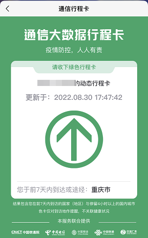 当你入住宾馆酒店时,工作人员会请你扫描“场所码”,出示“行程码”,提醒你通过“社区报告码”填写相关事项。如果扫描“场所码”显示出来是一个绿色箭头,也就同时说明你的“渝康码”是绿码。当然现场工作人员也有可能请你再专门出示一下“渝康码”。
