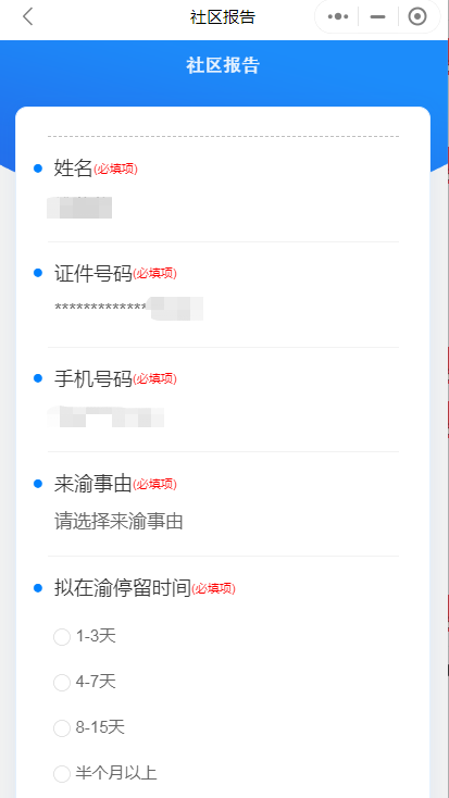 ——“社区报告码”:在“渝康码”平台的主页上,实际是一个“社区报备”的按钮,在现场粘贴出来的,就会显示为“社区报告二维码”,口头上习惯说“社区报告码”。这是用来主动申报和登记市外来渝返渝人员行程信息的。填完之后,社区工作人员就会接到你的信息,一般情况下你就不用再亲自跑着去社区了。