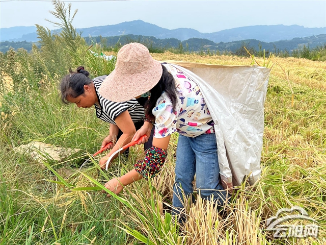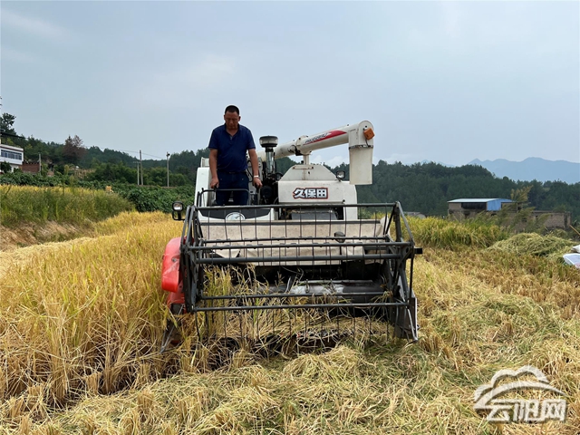 在大阳镇大树村,收割机正在稻田里工作,村民们拿着口袋跟在后面收捡割完的水稻。“我们今年种了33.3公顷水稻,以前我们用人工自己收割,起码要两个多月才收割得完。现在开展了社会化服务,他们来帮我们收水稻,两台大机器两个多星期就收割完了,给我们节约了人工成本,省了很多的时间。”大树村村民叶金元说。