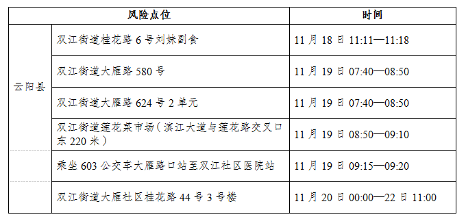 2022年11月23日,云阳县新增报告20例确诊病例(确诊病例1—20)和9例无症状感染者(无症状感染者1—9),现将在云主要活动轨迹的风险点位和时间通告如下: