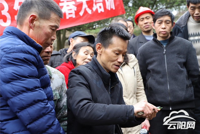 记者在现场看到,果品产业发展中心高级农艺师周辉现场演示柑橘的高接换种操作,并手把手教果农在原有老品种的枝干上改接优良品种。他说:“通过柑橘高接换种技术,可以让原来的老品种改换成新品种,让原来的老果树发新枝、结新果,提高柑橘的品质,增加大家的收益。”