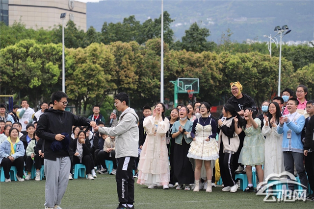 活动中,“你追我赶”、“毛毛虫接力赛跑”、“滚雪球”等趣味游戏让现场气氛高涨。毛毛虫上的师生,手脚并用,步调一致,奋勇向前;有速度与激情之称的“一圈到底”要求每班学生在横排站位中,用呼啦圈贯穿首尾,神还原了“霹雳舞”的初学阶段;还有部分同学玩起了角色扮演,雅致的汉服装扮、圈粉的卡通造型、自制的束发冲天……师生的同台竞技将活动推向最高潮。民歌大比拼、炫舞大放映,师生一起在扭腰、踢腿、旋转、跳跃中完成了一场青春飞扬的才艺展示。