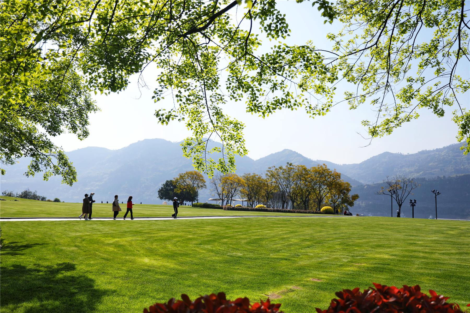 在月光草坪公园,一江春水绿如蓝,葳蕤芳草连成茵,绚丽绽放的春花、吐露新绿的大树点缀其间,让这片西南地区最大的人工草坪展露出一年之中的高“颜值”。草坪步道间,三五成群的游客散步赏景,好不惬意。 “我们慕名而来,月光草坪看起来比我们想象中的景色还要漂亮,绿油油的一片。”外地游客龚女士表示。