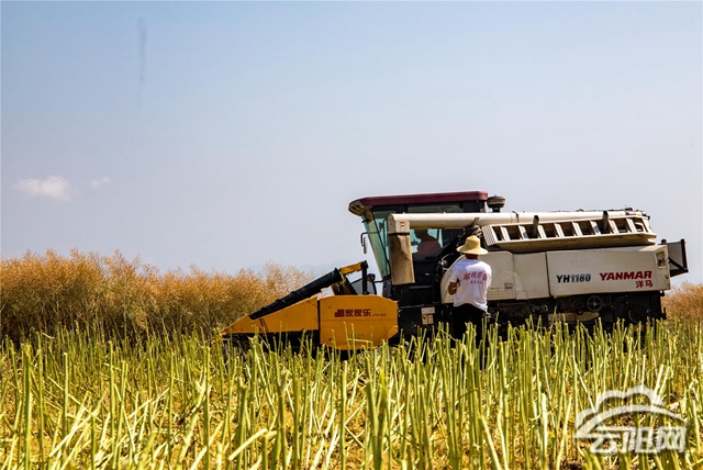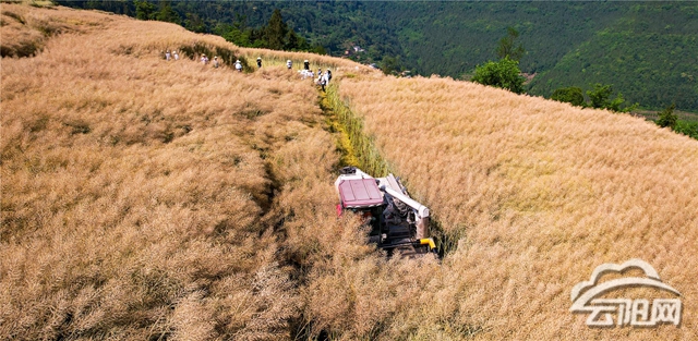 在盘龙街道旺龙村“高粱+油菜”轮作300亩高产示范片基地,漫山遍野的成熟油菜映入眼帘,油菜秆上的菜籽颗粒饱满,长势良好,犹如给广袤的大地披上了金黄的衣裳。轰鸣的收割机来回穿梭在油菜地里,一排排油菜卷入机器,快速地完成脱粒工作。