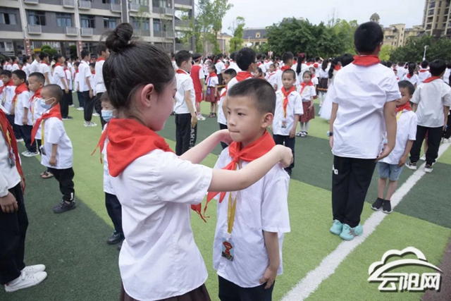 随后,学校举行了一年级入队仪式,五年级的老队员为新队员佩戴鲜艳的红领巾。