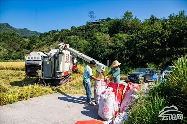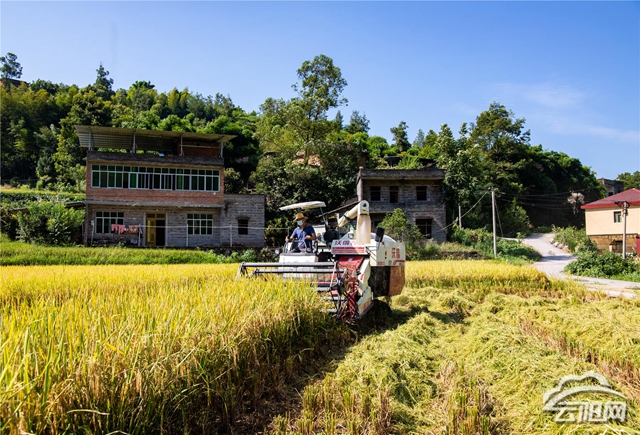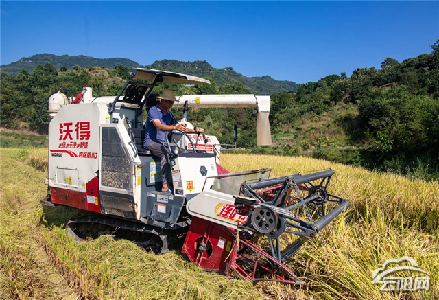 8月17日,在双龙镇文龙社区的宽阔梯田里,沉甸甸的稻穗压弯了稻秆,微风拂过,稻浪翻滚,放眼望去,青山、村庄与梯田在阳光的照耀下交相辉映。田间,收割机在金色的稻浪中来回穿梭,收割、脱粒、粉碎秸秆等工序一气呵成,率先拉开了云阳31万亩水稻开镰收割的序幕。