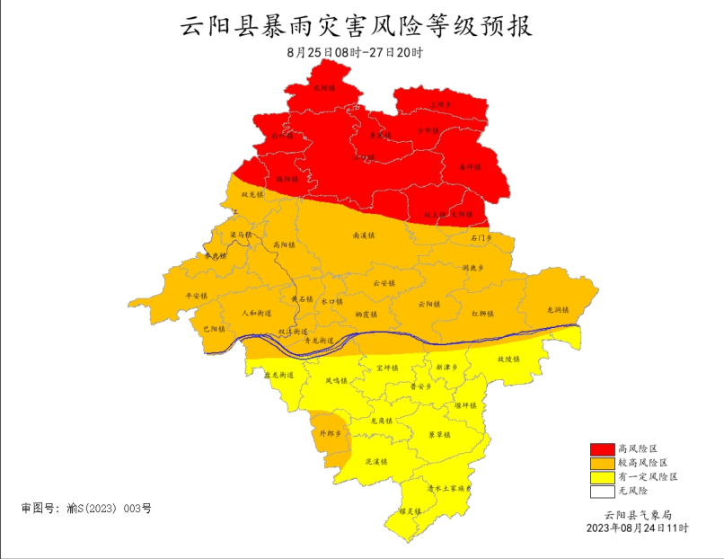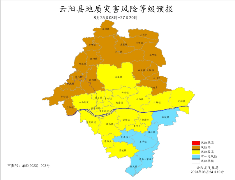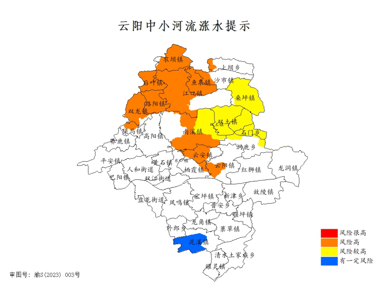 较高风险区:路阳镇、石门乡、养鹿镇、渠马镇、双龙镇、高阳镇、平安镇、洞鹿乡、云阳镇、黄石镇、人和街道、水口镇、栖霞镇、云安镇、巴阳镇;