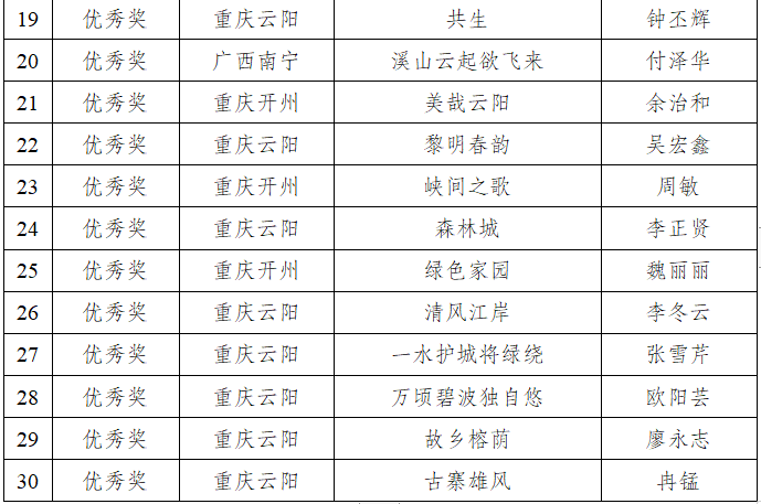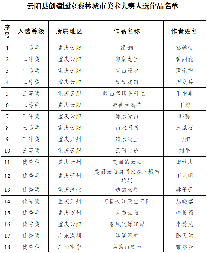 云阳县创建国家森林城市美术大赛经过专家评审及复核等程序,形成了入选作品名单,现予以公示。公示期为5天(自公示之日起计算)。公示期间,如有异议,请以书面方式向云阳县文联反映,并提供必要的证据材料,以便核实查证。同时,提出异议者须提供本人真实姓名、工作单位、联系电话等有效联系方式,凡匿名、冒名或超出公示期限的异议不予受理。