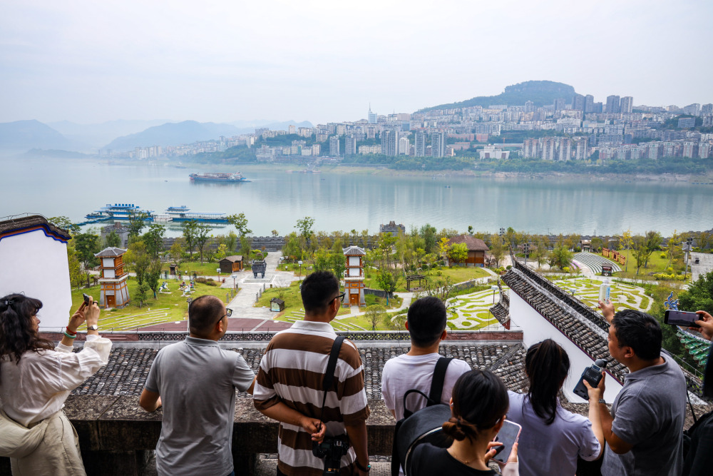▲9月11日,采访团在张飞庙中欣赏江景。记者 尹诗语 摄/视觉重庆