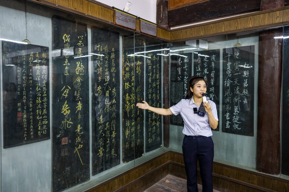 ▲9月11日,采访团探访张飞庙,导游正在介绍岳飞真迹碑刻。记者 尹诗语 摄/视觉重庆