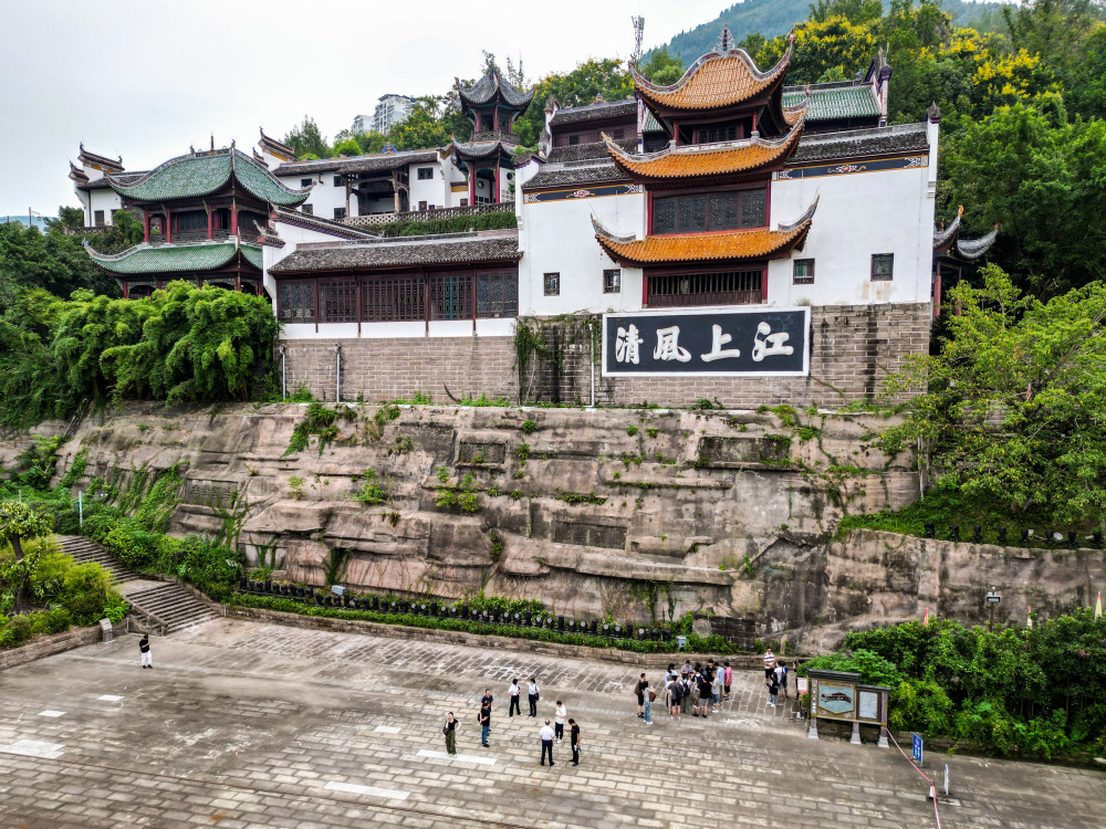 张飞庙雄踞长江南岸巨崖之上。清末著名书法家彭聚星手书的“江上风清”四个大字高悬在面江庙壁上,更增添了庙宇庄严肃穆的气势。