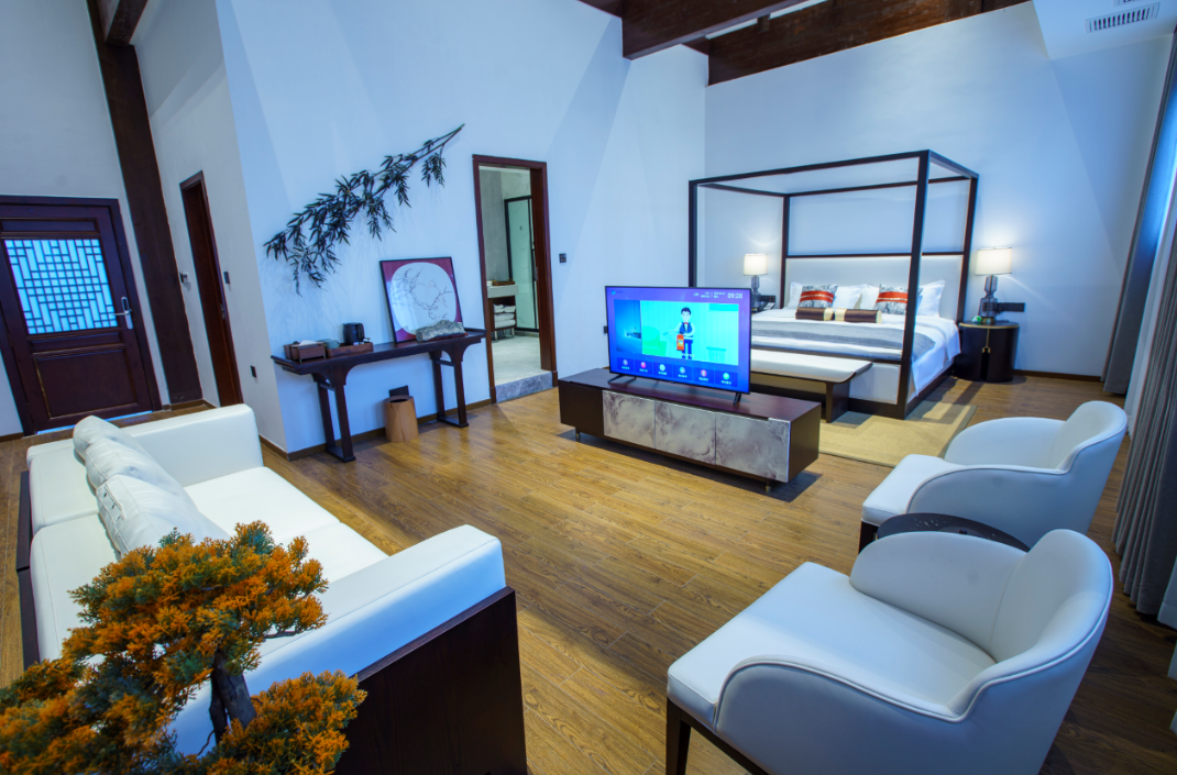 铜雀阁以典雅、柔美的装饰风格,民宿庭院深深,曲径通幽,环境宜人,室内空间用铜制的雀羽和沉香的古琴等提炼元素勾勒出三国女性的柔美。