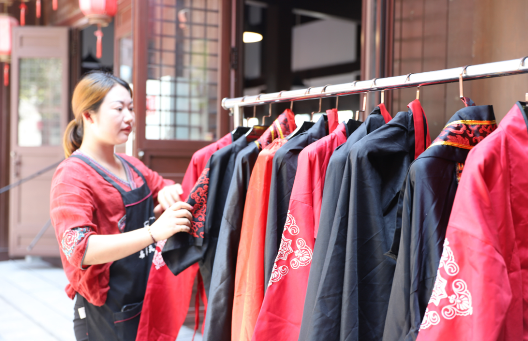 位于三国印巷的名羊天下烤全羊,新中式装修风格融合了现代的技术和传统的工艺,让人感受到一种新的视觉享受。店里还特意准备了华服展架,顾客可以挑选心仪的华服试穿,在三国印巷里拍照,不仅赏了风景,还能感受到“穿着华服吃烤全羊”的奇妙体验。