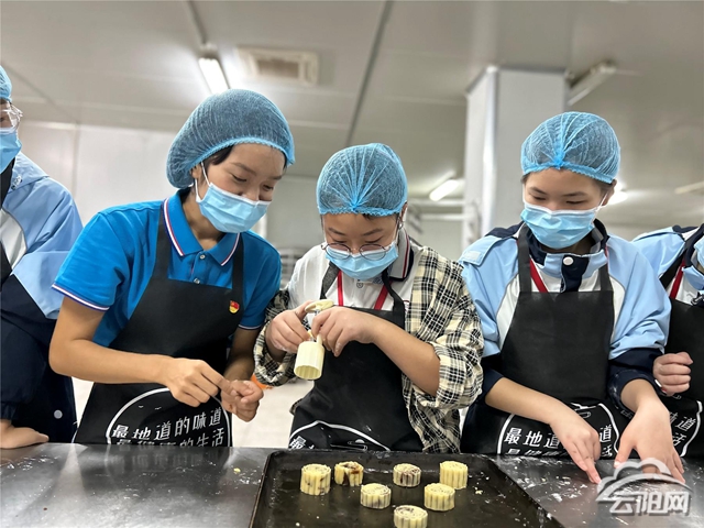 活动中,带队老师向孩子们讲述了中秋节的来历、习俗等知识,孩子们也分享了有关中秋的诗词与美食。糕点老师向大家示范了月饼制作的基本流程和方法,同学们认真聆听、跃跃欲试,揉面、剁馅、称重、包馅、烘烤……在专业师傅手把手的指导下,大家分工合作、相互配合,一会儿工夫,一个个造型精致、图案精美的月饼便摆满操作台。孩子们聚在一起,欣赏着自己的“杰作”,充满了成就感和喜悦感。等到香气扑鼻的月饼新鲜出炉,同学们纷纷围过来品尝,吃着自己亲手制作的月饼,更是酥甜入心。