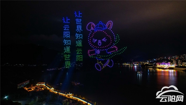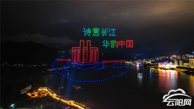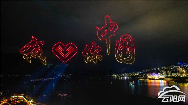 以天地为幕,以梯城为景,以光影作画。当800架无人机盘旋夜空,如璀璨繁星洒落人间,刻画出的“让世界知道云阳,让云阳知道世界”“天下龙缸,千年张飞庙”“黎明古村”“诗意长江,华韵中国”“我爱你中国”以及云阳城市IP兴云兔、云阳恐龙IP形象“龙宝”“乖妹”等文字和图案,令现场观众惊叹不已。大家在感受科技与文化魅力的同时,进一步加深了对云阳城市的眷恋、对传统文化的热爱以及对伟大祖国的由衷赞美。