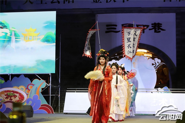 当晚,千年古庙旁,三国印巷里,人头攒动、分外热闹。随着一曲气势恢宏的打击鼓乐《中国龙》登场,现场气氛被瞬间点燃。舞蹈《只此青绿》舞尽了《千里江山图》的锦绣河山,让人徜徉在中国传统美学意趣之中;武术表演《凌云志》行云流水、刚劲有力、虎虎生威,让人感受到武术文化的魅力和风采;川剧《三英战吕布》造型国风味儿十足、表演惟妙惟肖引人入胜,让人瞬间梦回三国豪情战场;舞蹈《清平乐》飘渺灵动、步步生莲,让人在舞姿与旋律交织中只顾俗世清平;舞蹈《唐宫夜宴》服饰明艳动人、舞姿俏皮生动,让人在盛唐的三彩艺术独有意境中流连忘返;“大美长江”走秀展现千年文化历史创造出的风华绝代,带领大家共赴一场千年之约、穿越之旅……活动现场,众多市民游客纷纷拿出手机或相继,争相记录下一幅幅大美国风画卷,尽情享受这场视觉与文化的饕餮盛宴。