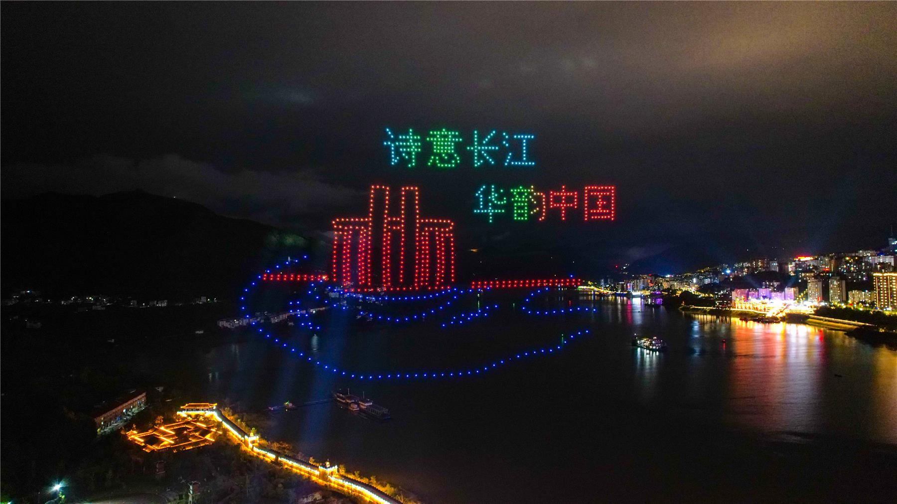 天空为幕,灯光为笔。晚上9点钟,在长江之畔的张飞庙景区,无人机编队表演在细雨蒙蒙中正式开场,800架无人机如夜空中的萤火虫,汇聚成多彩的造型,点亮长江两岸。在统一的指挥下,无人机编队随着灯光布阵交错起落,在夜空中不停变换队形,组成“嫦娥奔月”、“诗意长江 华韵中国”、“我爱你 中国”等图案,庆祝国庆和中秋佳节的到来。