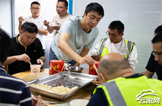 当热气腾腾的饺子端上桌,大家一起品尝着美食,讨论中秋民俗,品尝着团圆饺子和月饼,分享着快乐,互相祝福,感受着浓浓的节日温情。万运中是项目部一名老工友。他说,跟他工友在一起吃饺子宴过中秋节,很温暖。“我们放弃与“小家”的团聚,选择与“大家”一起坚守岗位,度过了一个别样的中秋。”