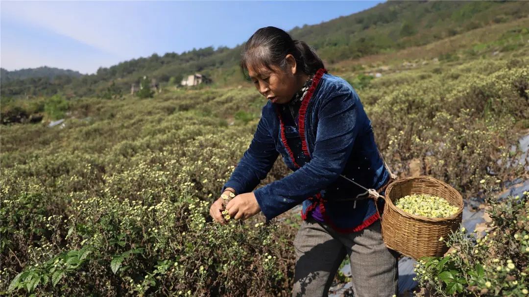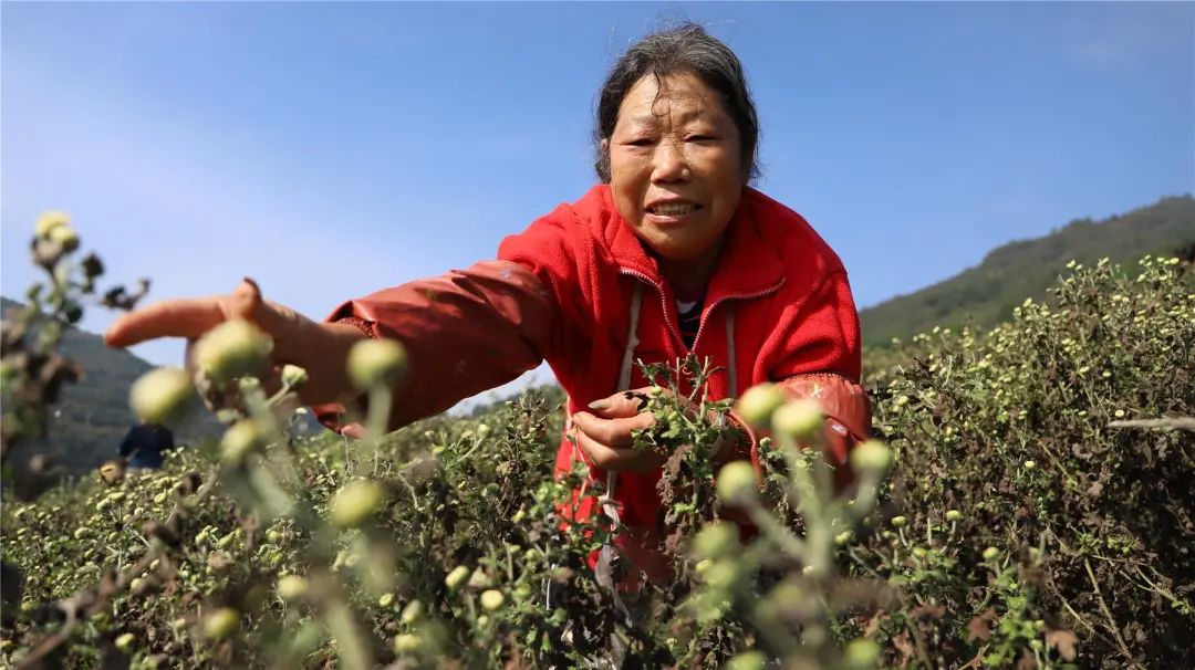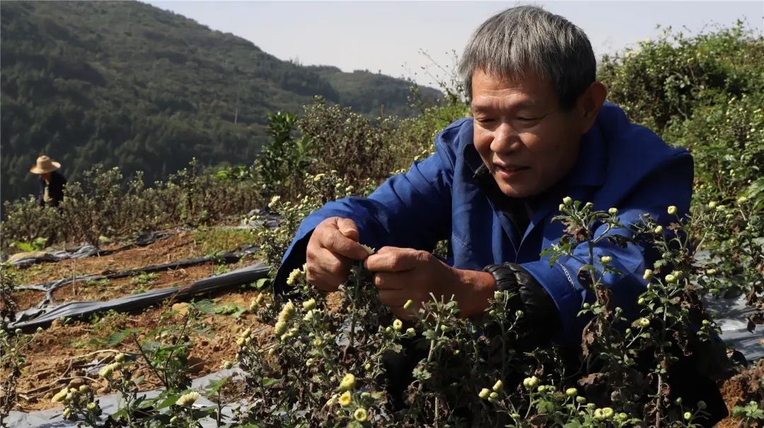 村民韩道银说:“在基地上工,一天是采摘8个小时,一个人能采摘120多斤菊花,能赚一百多块钱。”