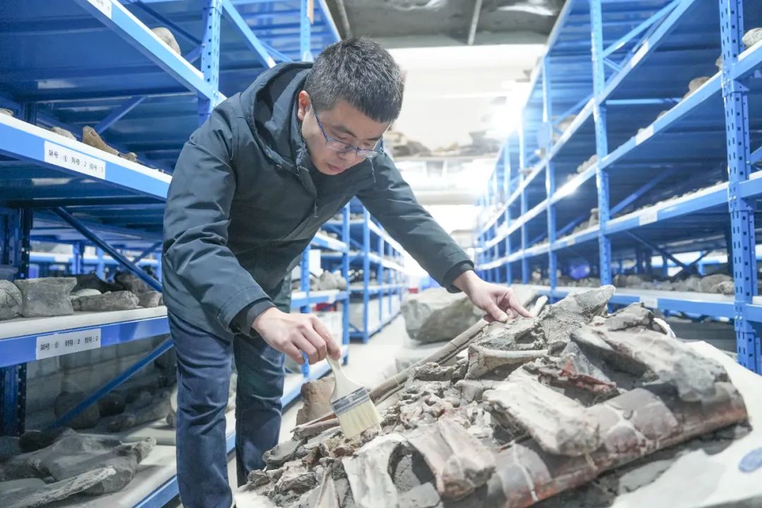 2023年2月20日,川渝共建古生物与古环境协同演化重庆市重点实验室化石仓库,实验室主任代辉正在测量化石。记者 谢智强 摄/视觉重庆