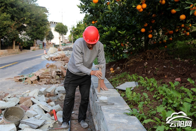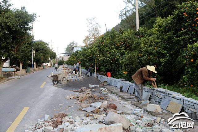走进新津乡新津村,集镇沿路有数名工人正开展整治作业,碎石、和水泥、砌墙……各工种人员有条不紊地配合着,协力修建景观石墙。整个景观墙项目有1公里长,还需近1个月的时间才能修建完成。