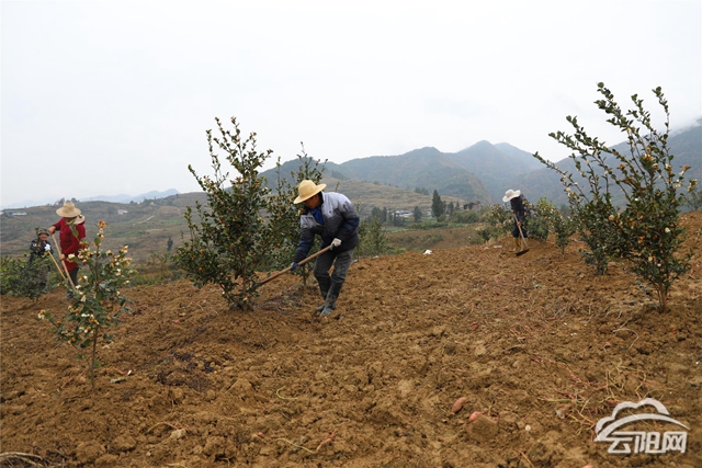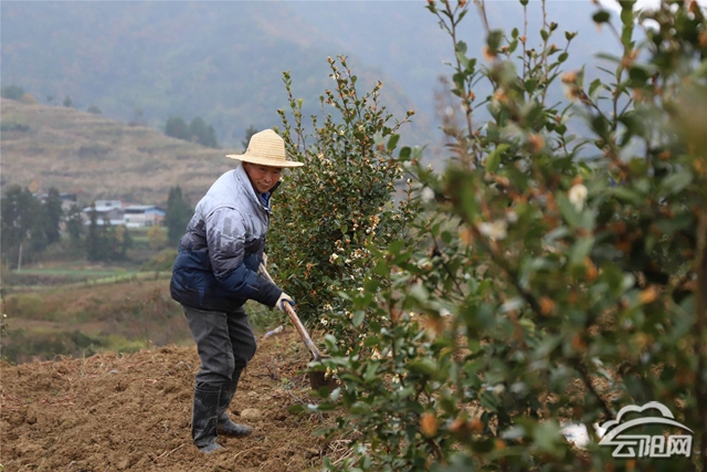 11月30日,在向家坪社区油茶种植基地,1200亩油茶树苗生机勃勃,长势正盛。村民们忙着对油茶培土、施肥,确保来年长势,呈现一派繁忙景象。
