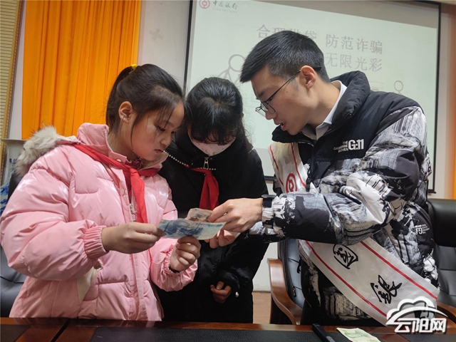 课堂上,宣讲员用浅显易懂、活泼明快的PPT、观看案例视频和现场互动的方式生动有趣地讲解了货币的“钱”世今生,围绕人民币正反面主景图案的来历、人民币防伪标识、反电信网络诈骗知识等内容进行详细讲解,进一步提高了同学们反假意识和假币鉴别能力,帮助同学们树立风险防范意识。