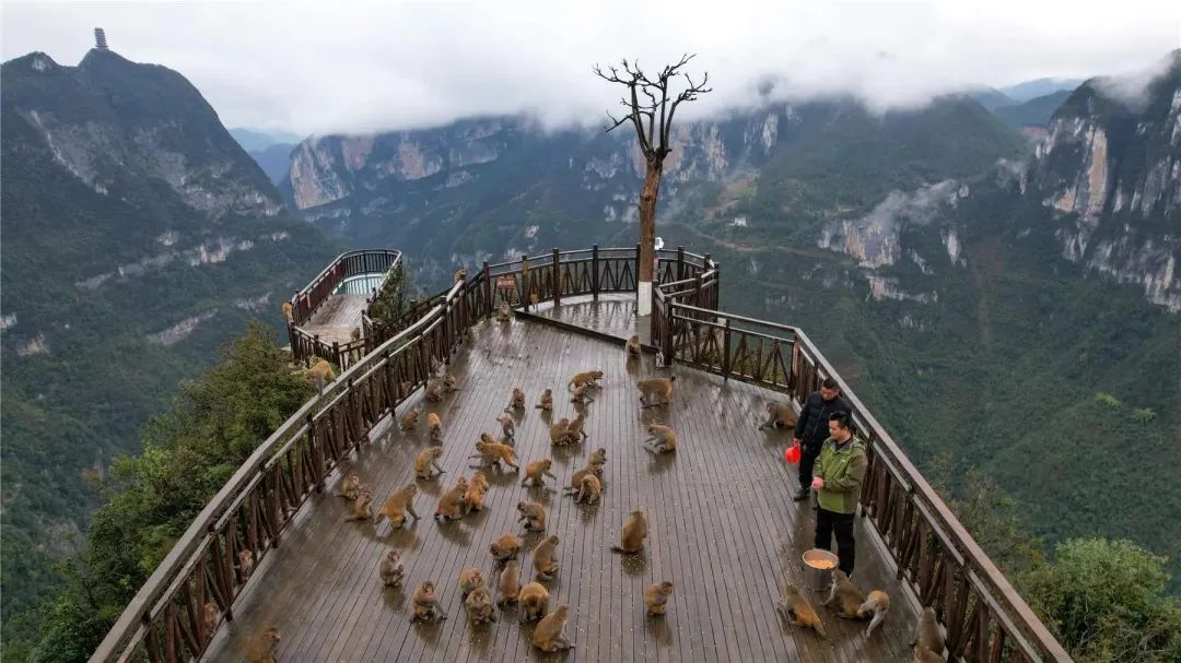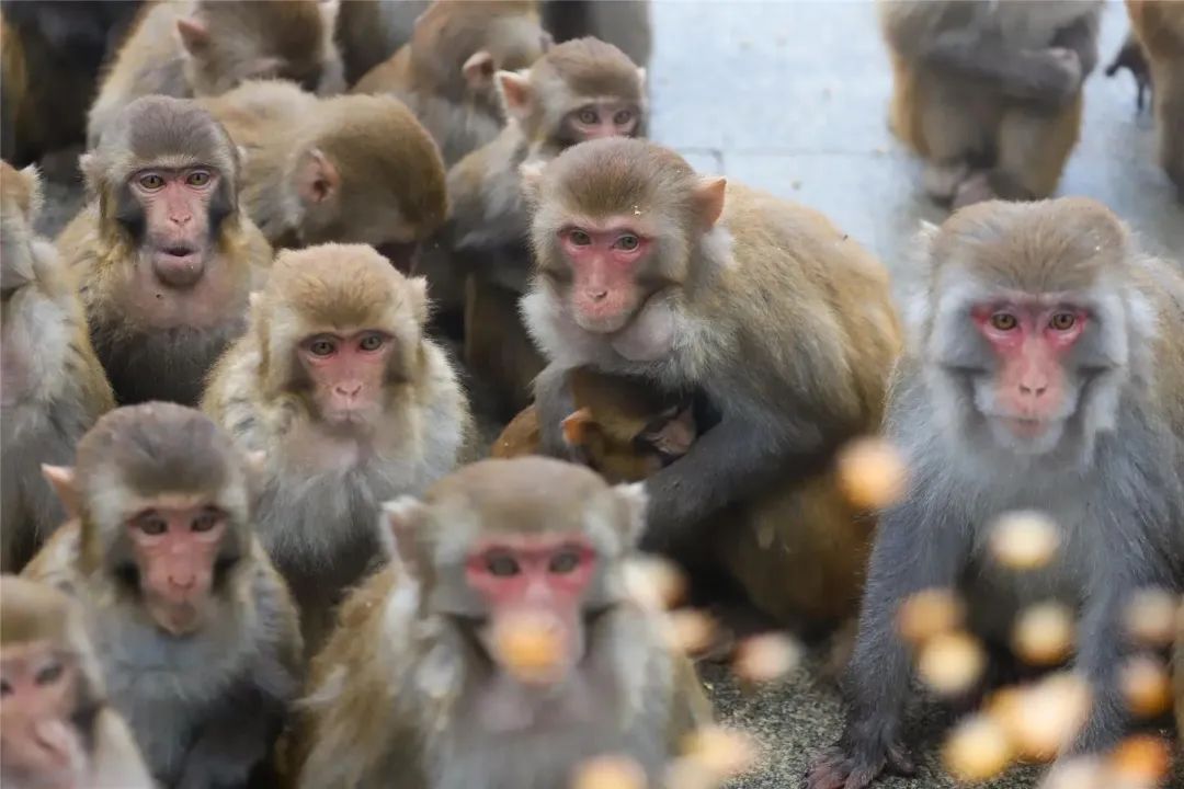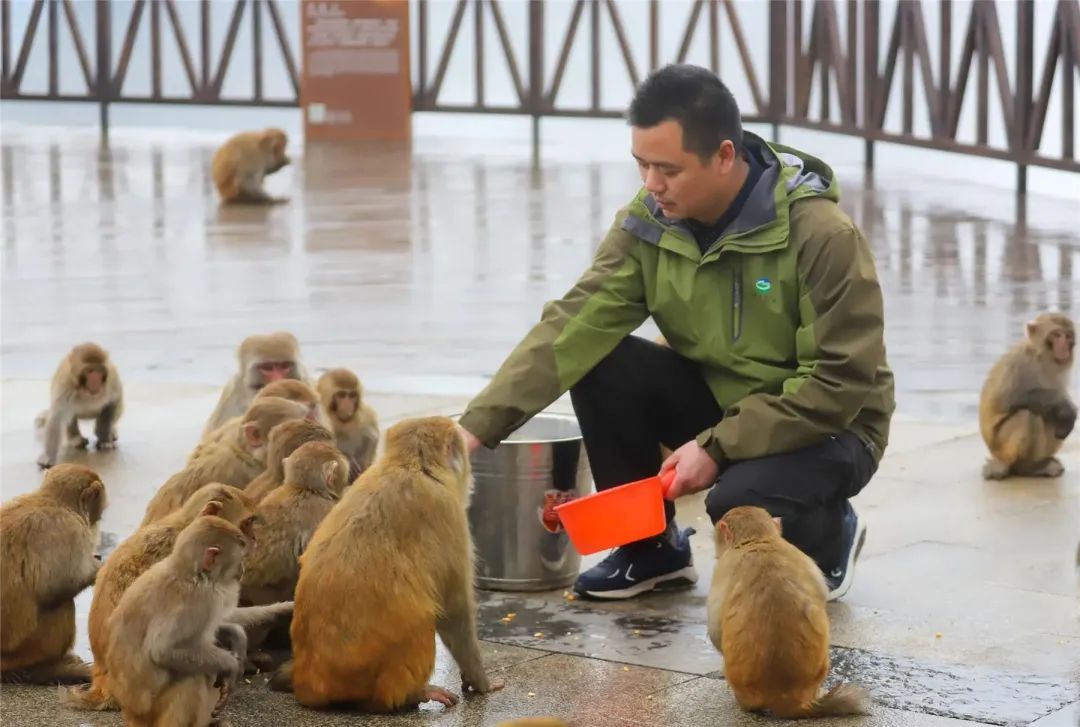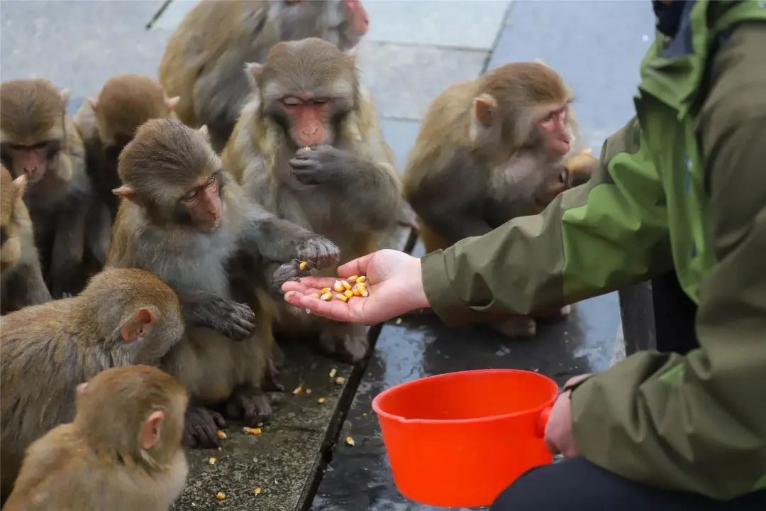 “我们针对猴子习性,在戏猴台这个地方设置了三到四个投喂点,采购了一批玉米、红薯、水果之类的食物,每天不定时的进行三四次投喂,让它们温暖过冬。”万显军介绍,在雨雪天气,他们会对猴子进行大量投喂,保证它有足够的体力。