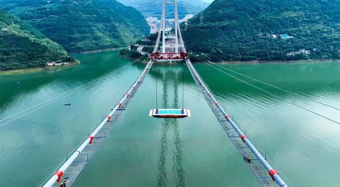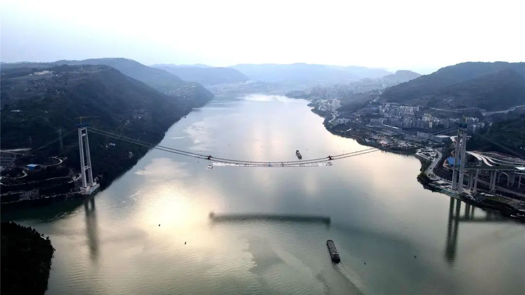 复兴长江大桥设计桥型是单跨钢箱梁悬索桥,大桥采取“一跨过江”的施工技术,主跨达到1208米,创下全市悬索桥的新纪录,成为长江上游跨度最大的悬索桥,目前已经完成整个工程量的83%。