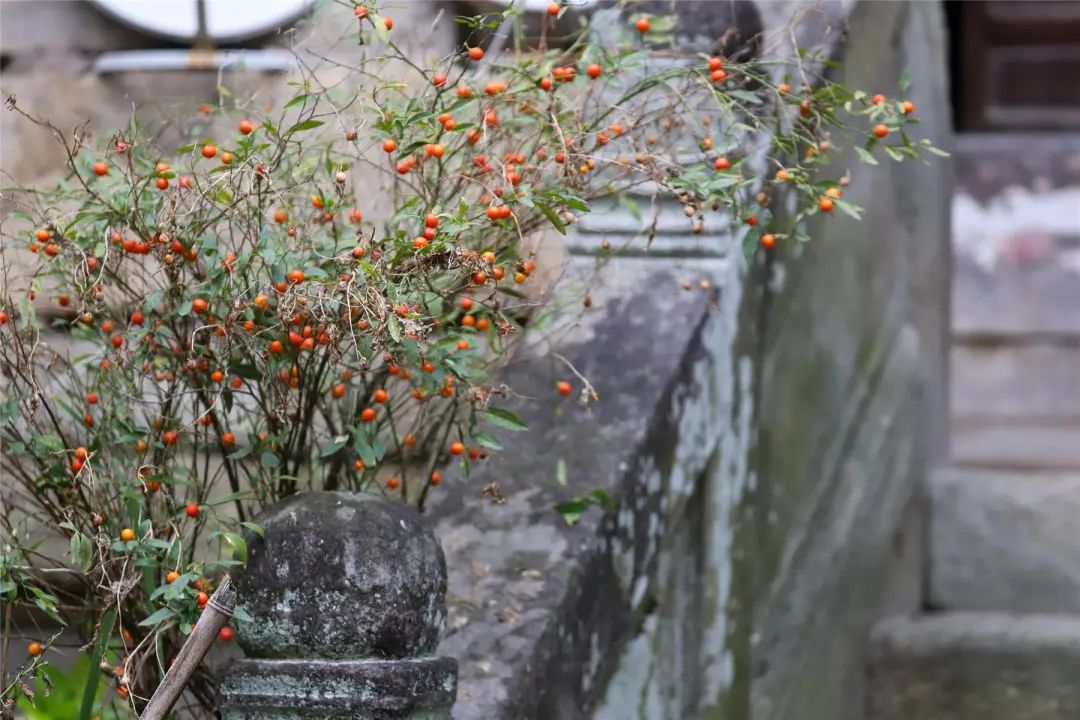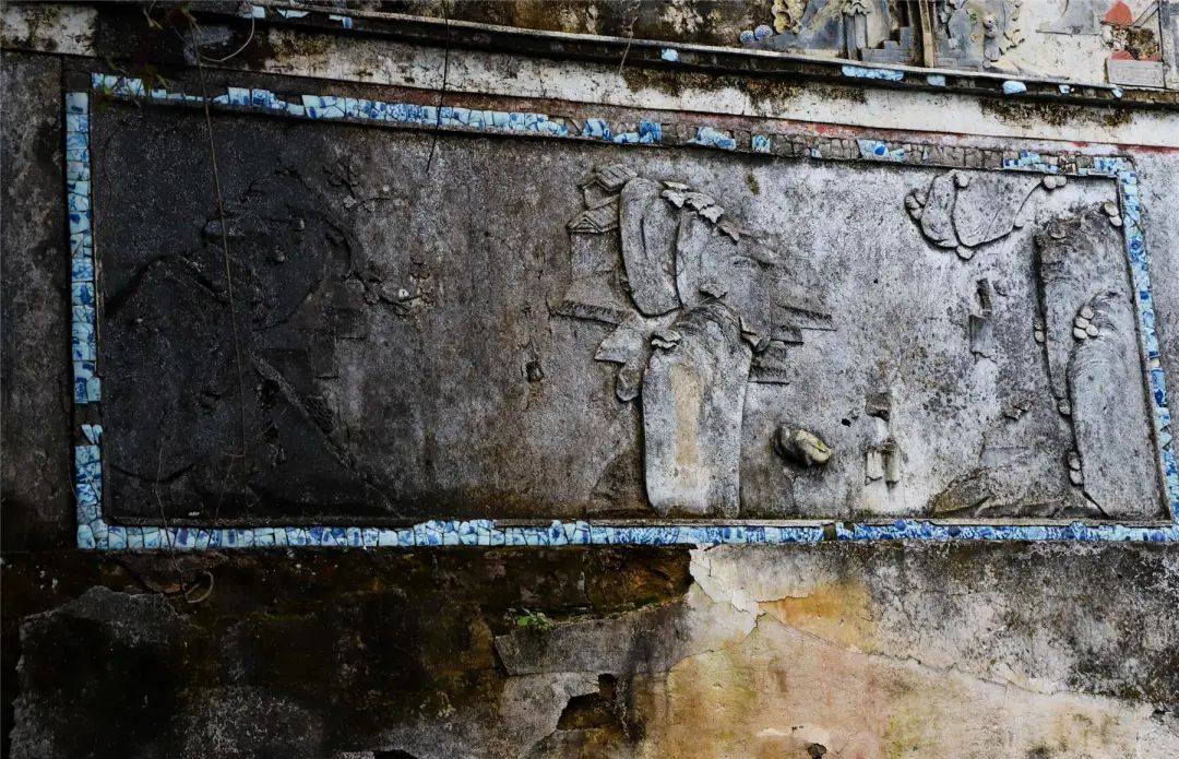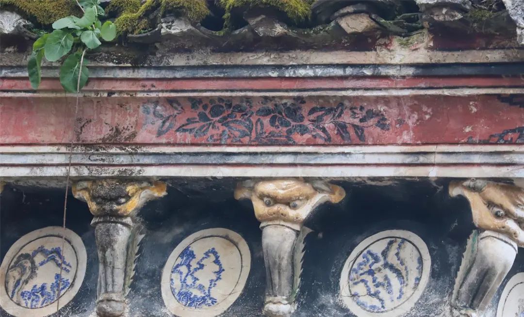 古宅的门楼檐脚,很是讲究,用精美的石雕作装饰。门楼横坊上,刻有雄狮雕饰,形象生动。门楼石墙的顶端布满了彩绘、灰塑,部分墙面采用了碎青釉瓷片作装点。细看门楼顶部的砖雕,串联着30余幅画像,有人物、花卉、山水等。
