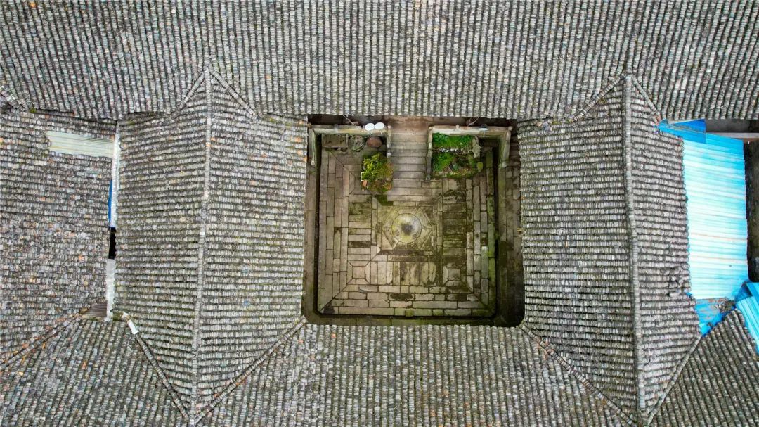 进入古宅,八卦形石板铺在正中,雕花木扇迎面而设。开敞式天井下,设有四方排水沟渠。可以想象,院内雨水不流向屋外,顺势纳入天井之中。