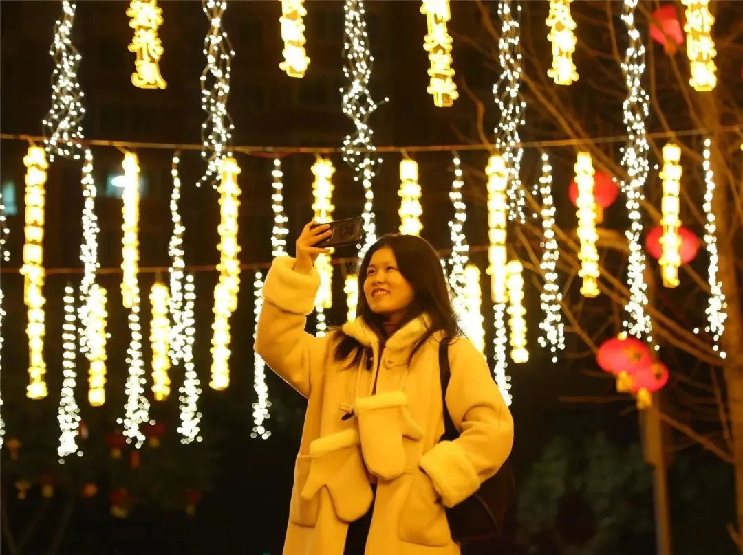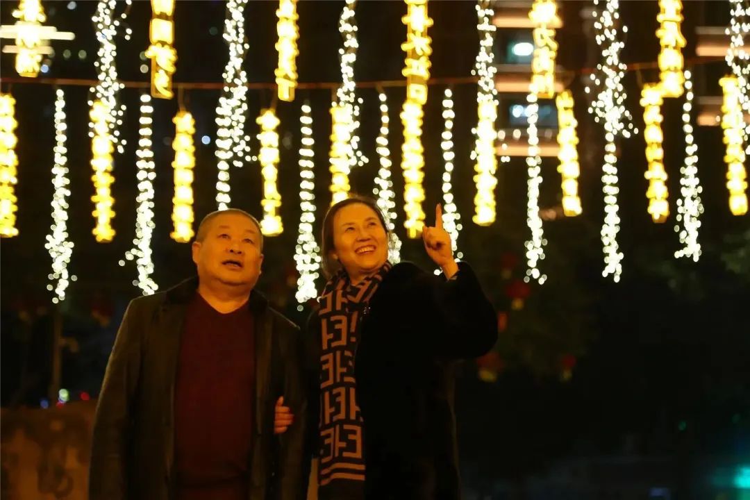灯一亮,便吸引了不少目光。陆陆续续有人前来欣赏打卡,家住附近的邓女士和丈夫在楼上看见亮灯,便专程下楼拍摄视频。“这确实很有创意,氛围感很强,年味儿也越来越浓了。”邓女士说。
