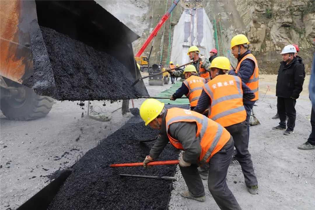 走进施工现场,施工检测人员正对出机口温度及入仓的沥青混凝土温度反复测量并记录,确保满足规范及摊铺试验要求,再由工人们完成沥青摊铺……