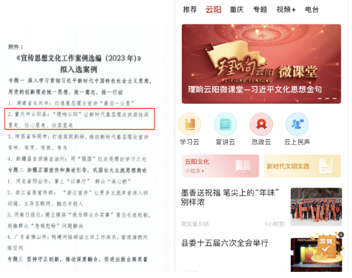 建立学习、宣讲、宣传和转化“四位一体”的“理响云阳” 理论传播工作体系,组建“磐下雲虹”宣讲队、多部门联动共建共享“理响云阳”App、公众号,在群众家门口“搭台唱戏”,在大众移动端“差异供给”,灵活开展“理响+”宣讲,推动党的创新理论成为广大党员干部群众政治上的主心骨、思想上的定盘星、行动上的指南针。“磐下雲虹”宣讲队开展重大主题宣讲活动7100余场次,2022年、2023年均荣获全市基层理论宣讲先进集体称号。“理响云阳”经验做法入围中宣部《宣传思想文化工作案例选编(2023)》。