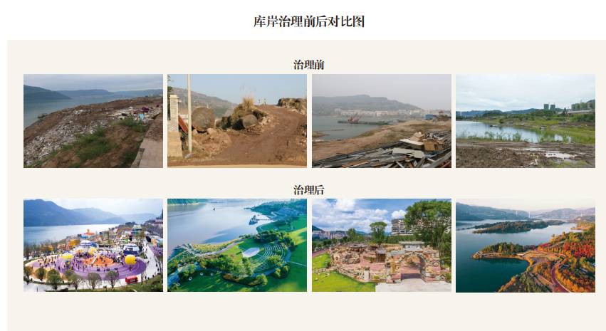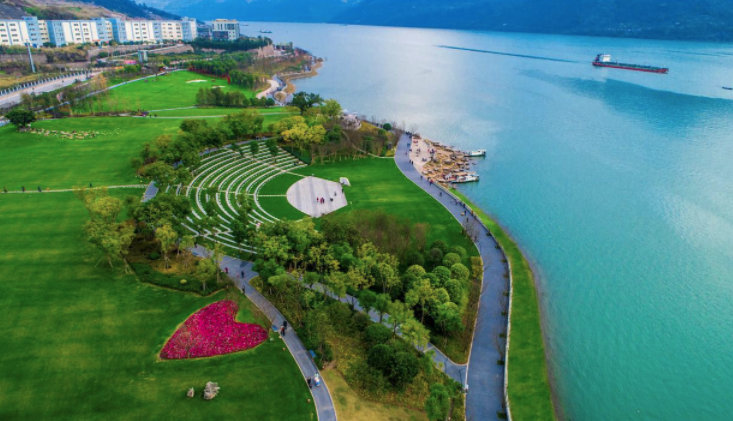 从2014年开始,云阳将库岸治理、生态修复和城市品质提升有机结合,围绕“骑走跑坐可享、山水花石可赏、文史科艺可品”的建设策略,规划实施云阳县城沿江库岸环境综合整治。历时7年精心雕琢,修复沿江库岸14处,治理河堤33公里、护坡77万平方米,绿化面积330公顷,过去的库岸“伤疤”,蜕变成城市绿脉。自行车道、漫步道、跑步道串联8个主题公园,内嵌各类场馆12个、体育场地46.81万平方米、休闲广场117公顷。通过库岸环境综合整治,云阳城市安全韧性不断提升,城市功能品质进一步完善,城市风貌焕然一新,实现市民“一天的公园、一年的公园、一生的公园”美好愿景。