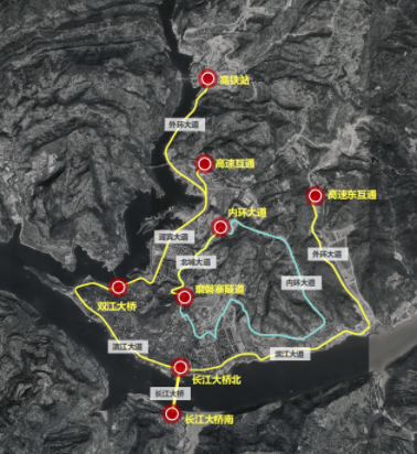 两路一桥八重门,负山抱水看云阳。未来,迎宾大道范围更宽广、内涵更丰富。大道包含高铁—高速东互通路段、磨磐寨隧道口—内环大道隧道口、长江大桥,沿线聚集了云阳八大代表性的节点,是未来景观、文化要素的展示地,初步规划打造成“八重门”。其中,“时代之门”凝聚云阳开拓包容的时代精神,建设具有云阳味的精神地标。“印象之门”将滨江景观、居住小区和社区公园串联,展示城市现代生活风貌。“郊野之门”将山景与建筑融为一体,打造近悦远来的标志性画卷景观。“梯城之门”保留崖壁原始生态风貌,将城市阶梯、崖壁建筑和社区公园串联,彰显梯城拾级而上的生活记忆。“磐石之门”“两山之门”综合彰显云阳开拓建城精神,展示城市发展的时代印记。“云江之门”“追忆之门”与生态的呼应。