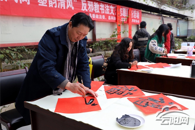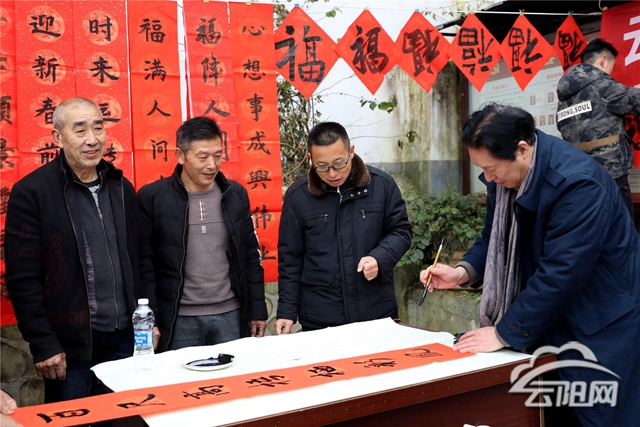 云阳网讯(记者 张扬凤)1月30日,县文联组织文艺志愿者到龙角镇开展新春送春联文化下乡活动,现场为当地群众书写春联和“福”字,赠送一份新年祝福。
