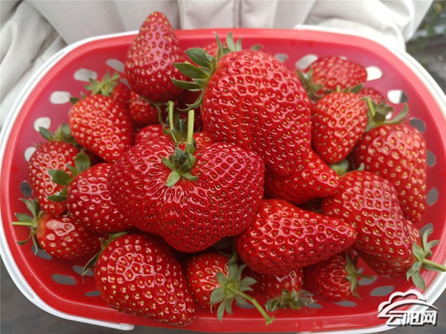 走进大棚内,清甜的果香扑面而来,只见所有的草莓并不是长在田垄上,而是栽培在一排排一米余高的钢架上。一颗颗粒大饱满的草莓泛着让人垂涎欲滴的光泽,煞是喜人。