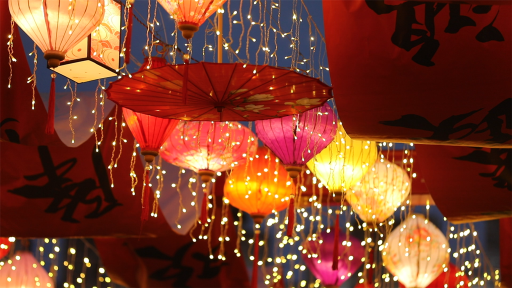 夜幕降临,城市的夜逐渐变得绚丽多姿、风情万种。从夜空俯瞰,万家灯火与一个个充满国潮风的小灯笼和闪亮的五角星交相辉映,在体现传统文化魅力的同时,也烘托出浓浓的年味。而穿行其间,犹如置身于华灯如昼的画卷之中。
