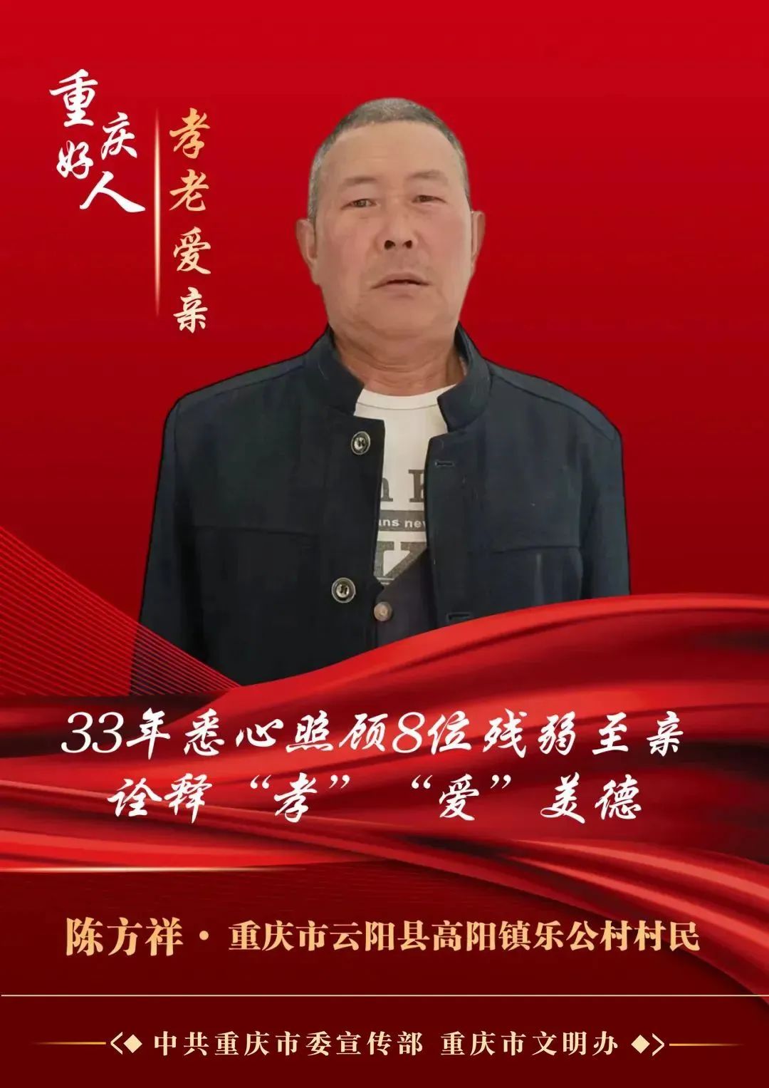 陈方祥,男,1958年10月生,重庆市云阳县高阳镇乐公村村民。1990年以来,陈方祥悉心照顾体弱多病的父母,用心陪伴中年丧偶、老年丧女的岳父,他白天忙生产,晚上床前尽孝,喂药喂饭、端屎接尿、擦身子等,让三位老人安度晚年。