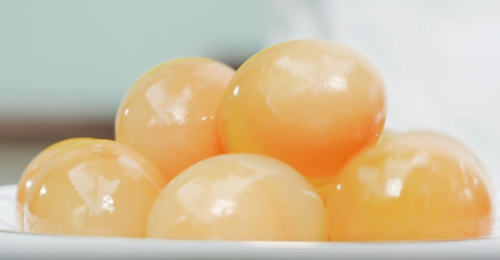 这段时间,袁廷明正忙着赶制订单,紧盯生产进度。和别家不一样,袁廷明工厂里生产的皮蛋,保质期较短,颜色金黄,无一丝黑色杂质。空口品尝,蛋黄香醇浓厚,碱味淡,口感更好。敲掉外衣,剥开蛋壳,切开后分三圈不同的色彩,外圈金黄透亮结成晶状固体,中圈略带黄色,较软,里圈呈金黄色,为溶糖状,称为“糖心蛋”。