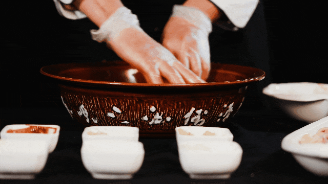 清洗完备的肥肠切片过后就来到腌制环节,沥干水分过后,加入米面、盐、白酒、秘制剁椒酱,缓慢搅拌均匀至米面变成红色,和肥肠较好融合便可进入下一步骤。装坛的过程急不得,需要一层层铺垫。取适量鲊肥肠平铺于罐内,用手压紧,晒上一层米面。反复几次,将鲊肥肠层层压实,尽可能排除罐中的空气。最后扎紧开口,将瓦罐倒置保存。