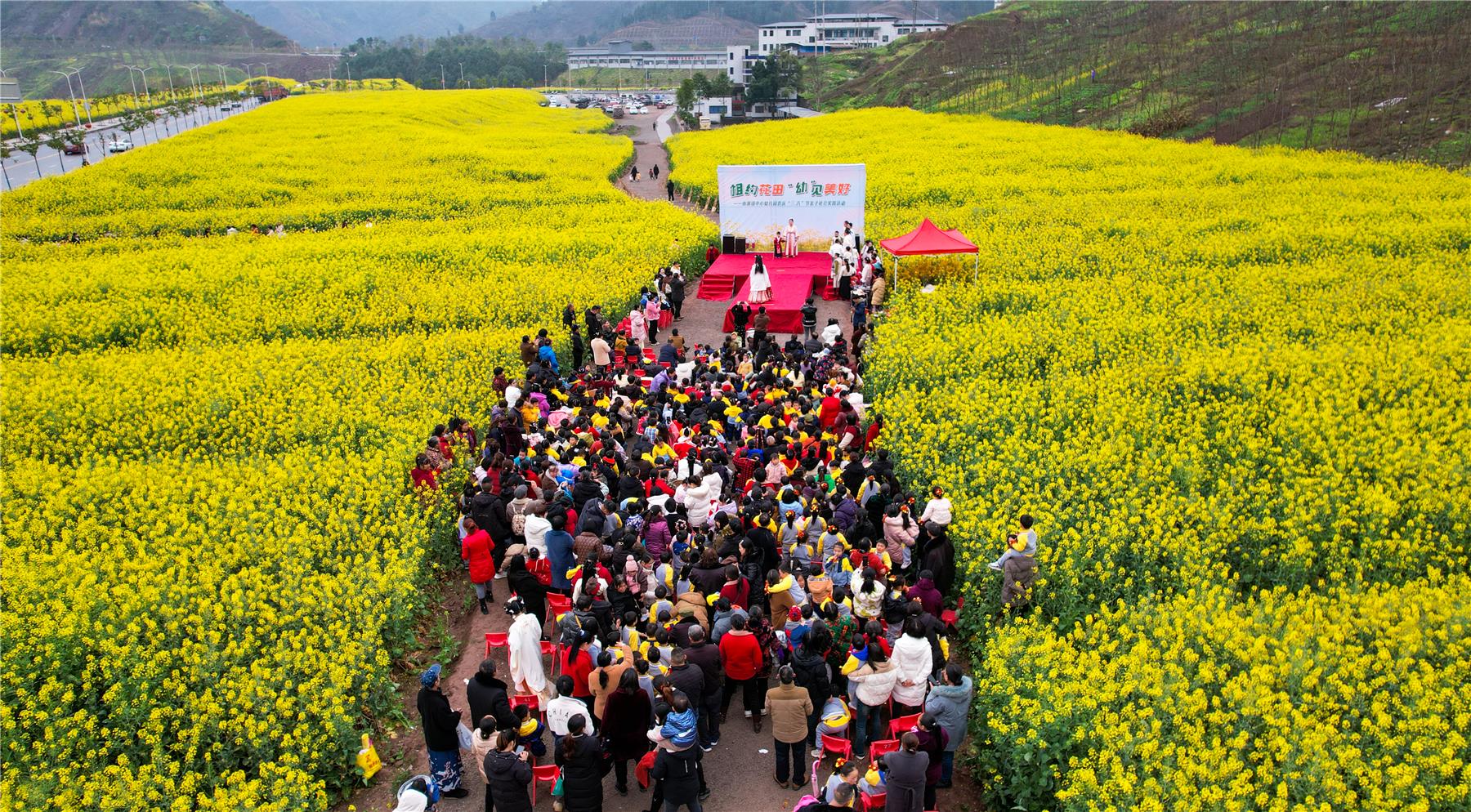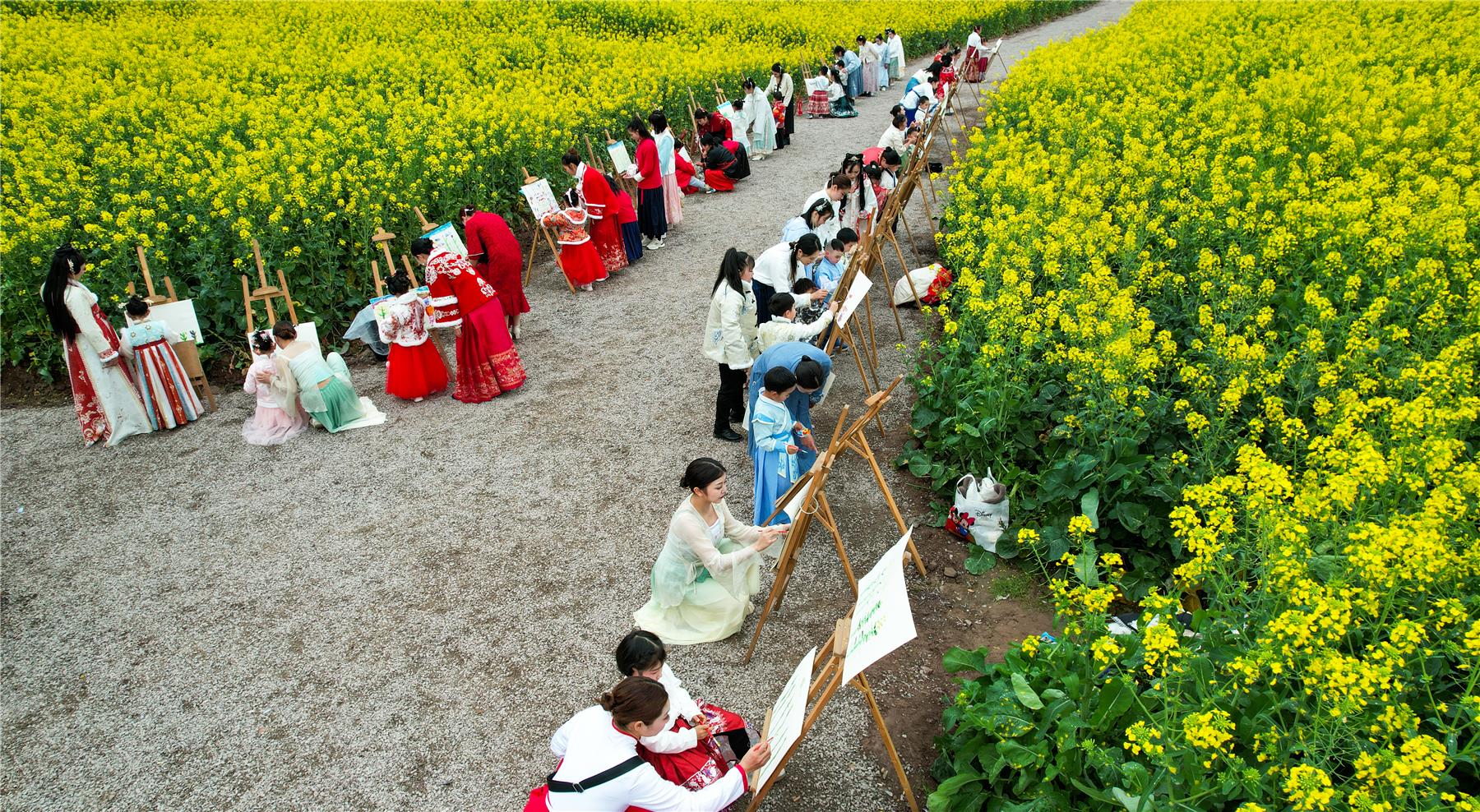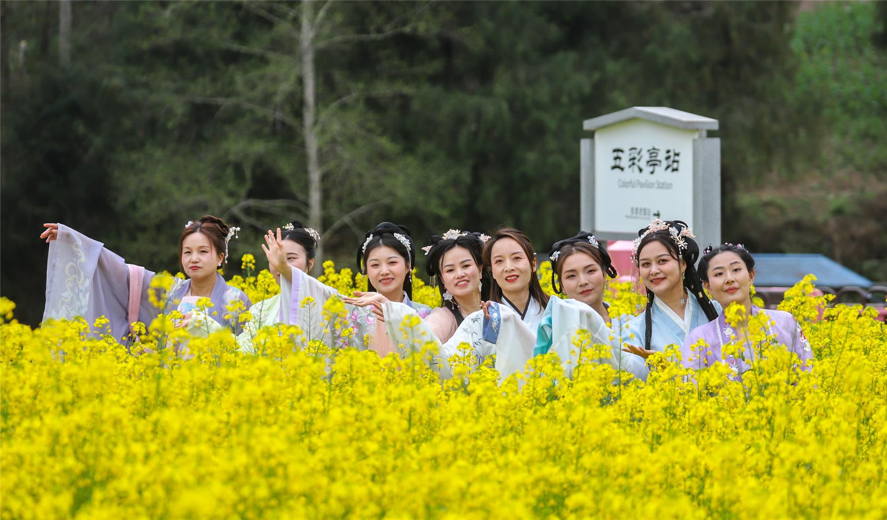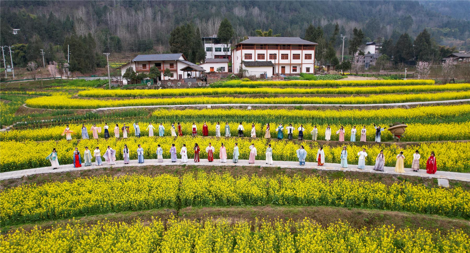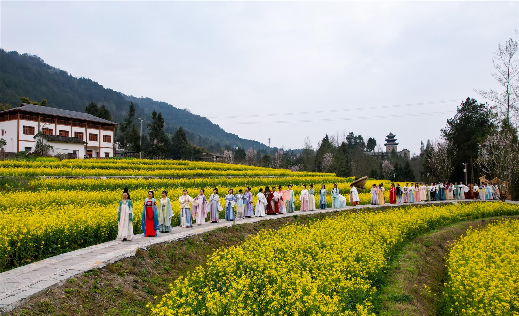 走进黎明古村,油菜花田在风中轻轻摇曳,如一片金色的海洋,充满了生机与活力。女教师们淡描娥眉,浅施粉黛,云鬓高挽,步摇轻颤、笑颜如花。曼妙多姿的她们,穿梭在花海中,与金黄的油菜花海交相辉映,形成了一道亮丽的风景线。一颦一步自成风景,千娇百媚尽显风采,既演绎了中国传统服饰之美,又展示了东方女性贤淑、典雅的气质。“着我汉家衣裳,兴我礼仪之邦。我们身着华服来到花田走秀踏青欢度三八妇女节,展现我们新时代女性的自尊、自立、自信、自强,发扬优秀的传统文化。”云阳县教育委员会办公室工作人员范燃新说。