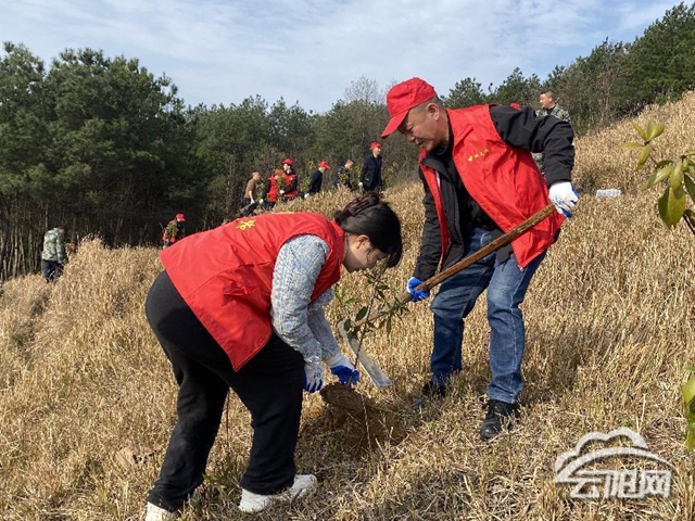植树现场,大家热情高涨、干劲十足,或两人一组、或三五成群,纷纷撸起袖子,扶树正苗、挥锹培土、踩土定植、提桶浇水……干得热火朝天。经过大家共同努力,种下的新苗迎风挺立在山坡间,传递着春的生机与活力。