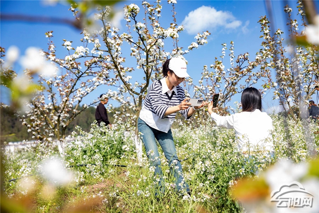 漫步园区,梨花笑迎春风,在蓝天白云下不停地摇曳;饱经风霜的枝条蜷缩成各种形状,形成不同的画框。游客穿梭其间,在自然的画框里摆着各种姿势,按下快门,将一幅幅美好的画面在梨花园里定格。