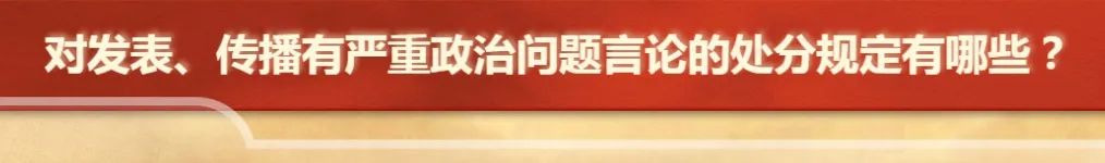 《中国共产党纪律处分条例》第五十条、第五十一条、第五十二条对发表、传播有严重政治问题的言论行为列出负面清单,目的是严格规范党员言论,以严格的纪律处分规定保障四项基本原则、改革开放决策、党中央大政方针贯彻落实,维护党和国家形象,维护党和国家领导人威信,维护英雄模范形象,坚决反对歪曲党的历史、中华人民共和国历史、人民军队历史的行为,维护党的团结和统一。发表、传播有严重政治问题的言论行为主要有以下几类:
